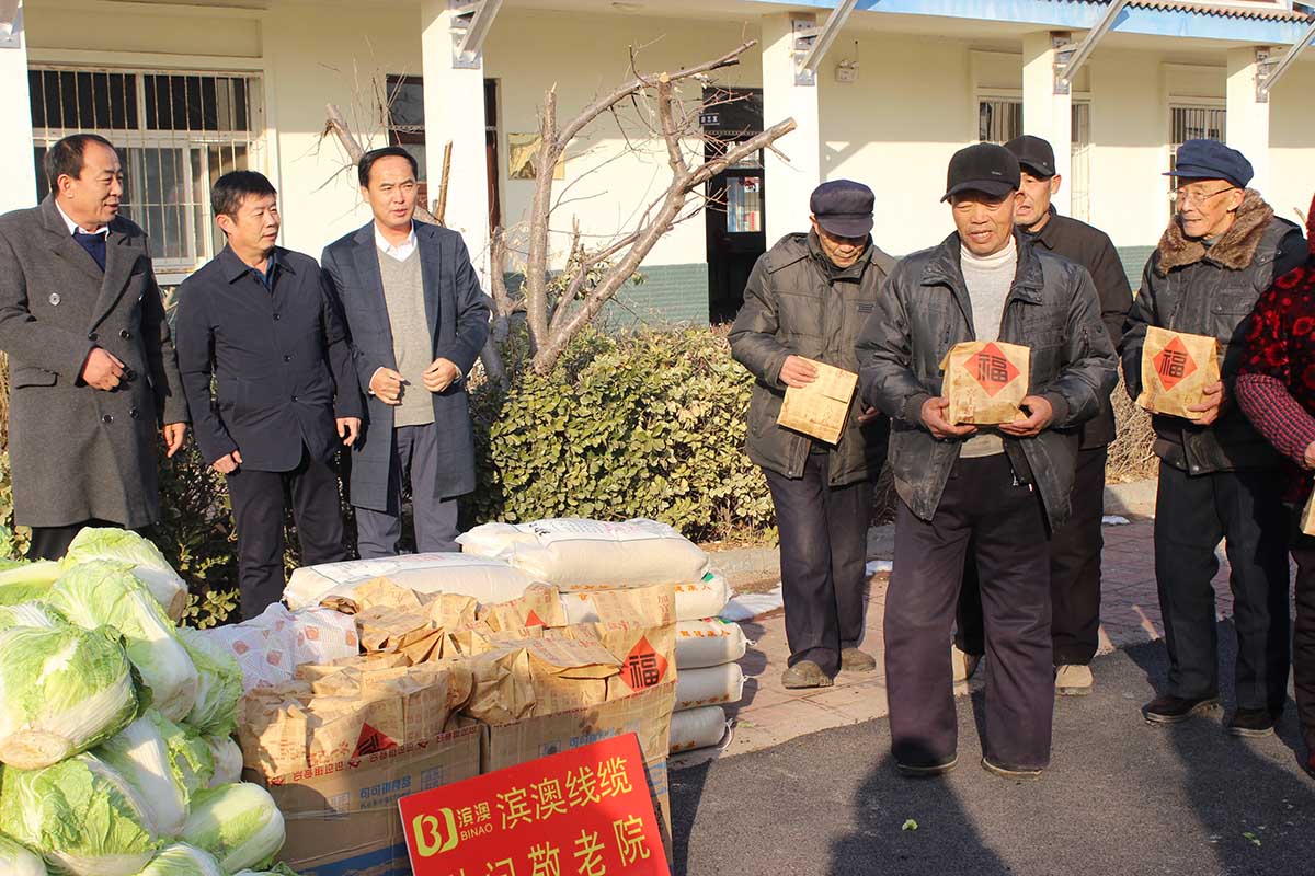 2018年12月29日,濱北辦事處人大委員會(huì)主任王孟峰、副主任王霞以及山東濱澳電線電纜有限公司總經(jīng)理、濱城區(qū)工商聯(lián)副會(huì)長(zhǎng)董桂光等一行人來(lái)到濱北中心敬老院看望慰問(wèn)生活在那里的老人和工作人員,濱澳線纜并為他們送上蔬菜、米、面等慰問(wèn)品。同時(shí)為每位老人準(zhǔn)備了一份節(jié)日禮物。